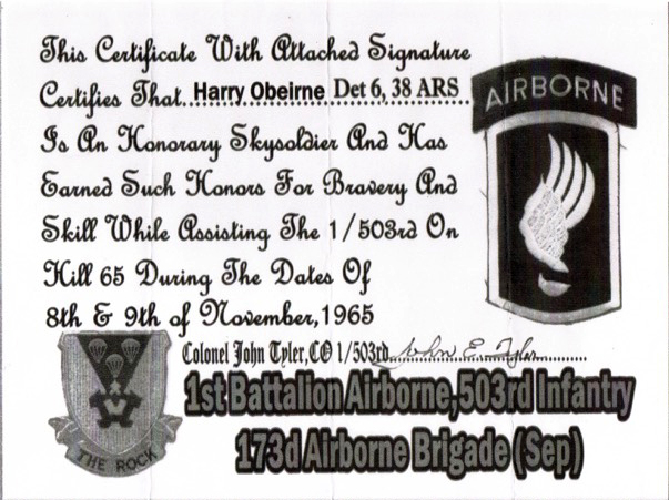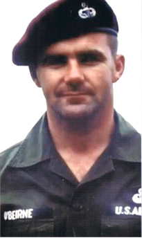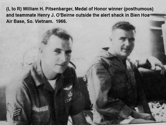 Henry O'Beirne was born in Dublin, Ireland on 16 August 1937. He immigrated to the United States in 1958 and settled in New York City for one year. He enlisted in the US Air Force and trained to become a medical corpsman. He attended the US Army Paratrooper School, the US Navy Underwater Swimmers School, Mountain Survival School and the Jungle Survival School in the Philippines. After two years of this training, Henry O'Beirne was accepted into the Air Force's Pararescue Field. His first assignment was Tachikawa Air Base, Japan. From there he was sent to many islands and countries in the Pacific theater in support of rescue operations and water recovery of space craft. His first TDY to South Vietnam was on 3 December 1963. Over the next two years, Staff Sergeant O'Beirne participated in 359 rescue combat missions. During this time, he was awarded three Distinguished Flying Crosses with V Device. The first award was for the sea rescue of a U.S. navy pilot off the city of Vinh, North Vietnam on 9 April 1965 while receiving enemy mortar and machine gun fire. His second award was for voluntarily getting off the rescue helicopter to become a medic and ammo runner for the encircled 503rd Infantry Battalion, 173rd Airborne Brigade from 8 to 9 November 1965. The third award was for participation in the attempted rescue of a pilot while under enemy machine gun fire on 17 December 1965.