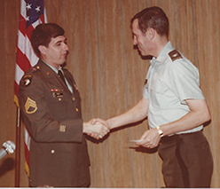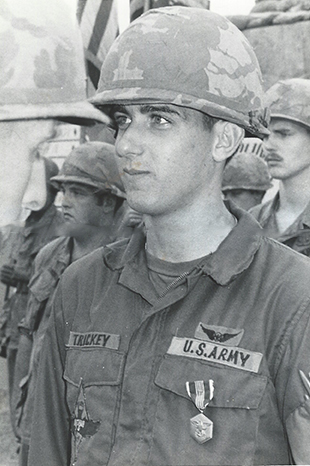 Specialist Four Kenneth G. Trickey distinguished himself by valorous actions on 12 December 1970 while engaged in a rescue mission. On that night a patrol had inadvertently entered an uncharted mine field in a dense fog, exploding one mine and suffering several casualties. Aware that one rescue helicopter had already returned unsuccessfully due to the extremely hazardous weather conditions, Specialist Trickey volunteered to participate in a second rescues effort, willing to risk his own life for the lives of the wounded men. Hovering in a dense fog above the mine field, the crew realized the continuous risk of detonating a mine or trip wire with their rescue efforts of the rotor wash of the helicopter. Although Specialist Trickey has never operated hoist equipment, he assisted in successfully lifting the remaining wounded man under the adverse conditions. Without any hesitation, he helped the wounded soldier into the ship by leaning far out of the aircraft. For his heroic actions, Kenneth G. Trickey was awarded the Army Commendation Medal with Valor.